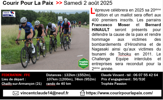 Un maillot anniversaire offert aux 400 premiers inscrits Le Challenge Equipe reconduit pour 4 coureurs(es) seulement Une épreuve VAE créée sur le parcours de 80km Une rando vintage de 60km pour les passionnés Une rando découverte de l’Auxois de 40km